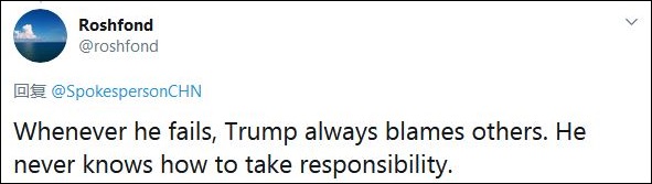 例如,一名網(wǎng)友寫(xiě)到:“當特朗普失敗的時(shí)候,他從來(lái)都是指責別人,他永遠不知道如何負責任!