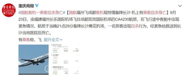 9月23日晚,有網(wǎng)友爆料國航CA4230航班疑似有乘客自殺,最后飛機備降長(cháng)沙。據了解,該名乘客被送到長(cháng)沙醫院后,搶救無(wú)效死亡。