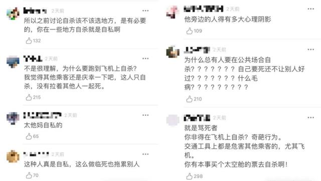 有人在飛機上出生,人們?yōu)槟缸悠桨差~手稱(chēng)慶,有人在飛機上了斷生命,憤怒的人不在少數,因為自殺者的行為本身不僅給他人的生活造成極大困擾,而且飛機本身的額外起降,也增加了飛行事故的可能,此外,航空公司也將為此承擔額外的開(kāi)支。